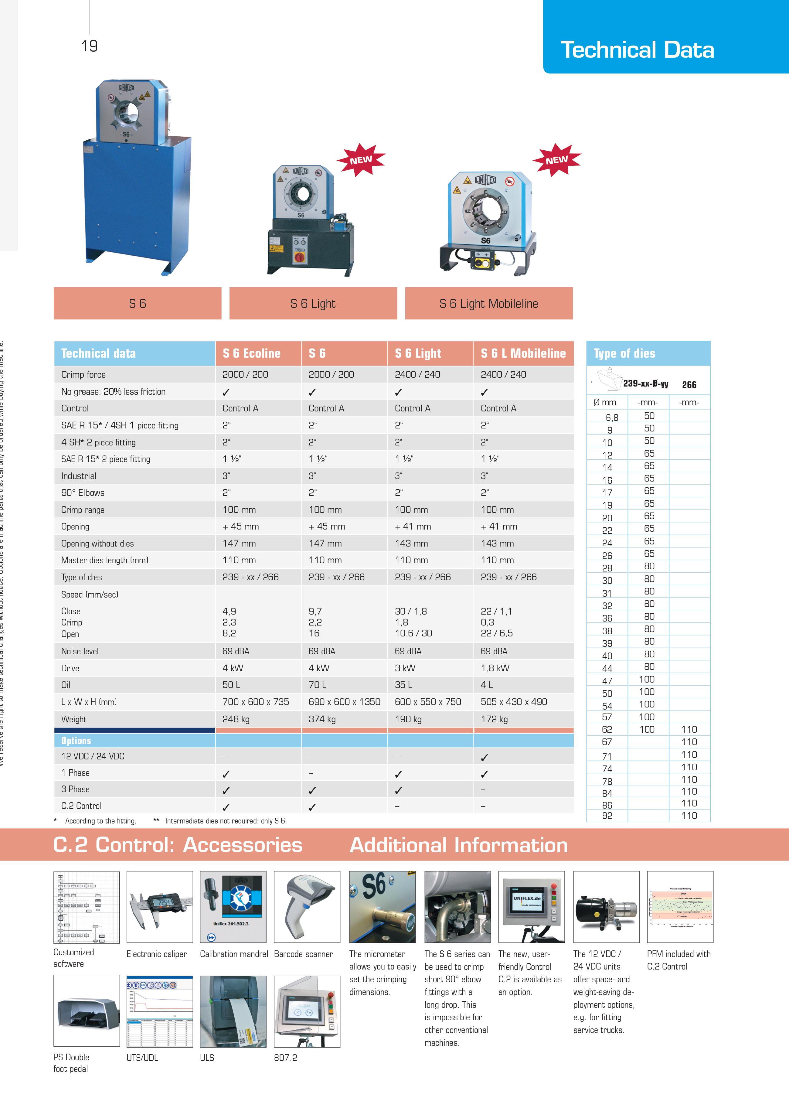 هدف گذاری و طراحی اصلی این دستگاه برای پرس شیلنگ هایی تا قطر ۲ اینچ است. با این حال توانایی پرس شیلنگ های صنعتی باقطر حداکثر ۳ اینچ را هم دارد. این دستگاه دارای ۱۰ مجموعه قالب است اما ست های بیشتر هم موجود هستند که از ۶.۸ میلی متر شروع می شود و تا ۹۲ میلی متر هم میرسد افزون بر موارد گفته شده پرس شیلنگ S ۶ اکلاین دارای مزایای بسیاری است که از جمله آنها میتوان به موارد زیر اشاره کرد.