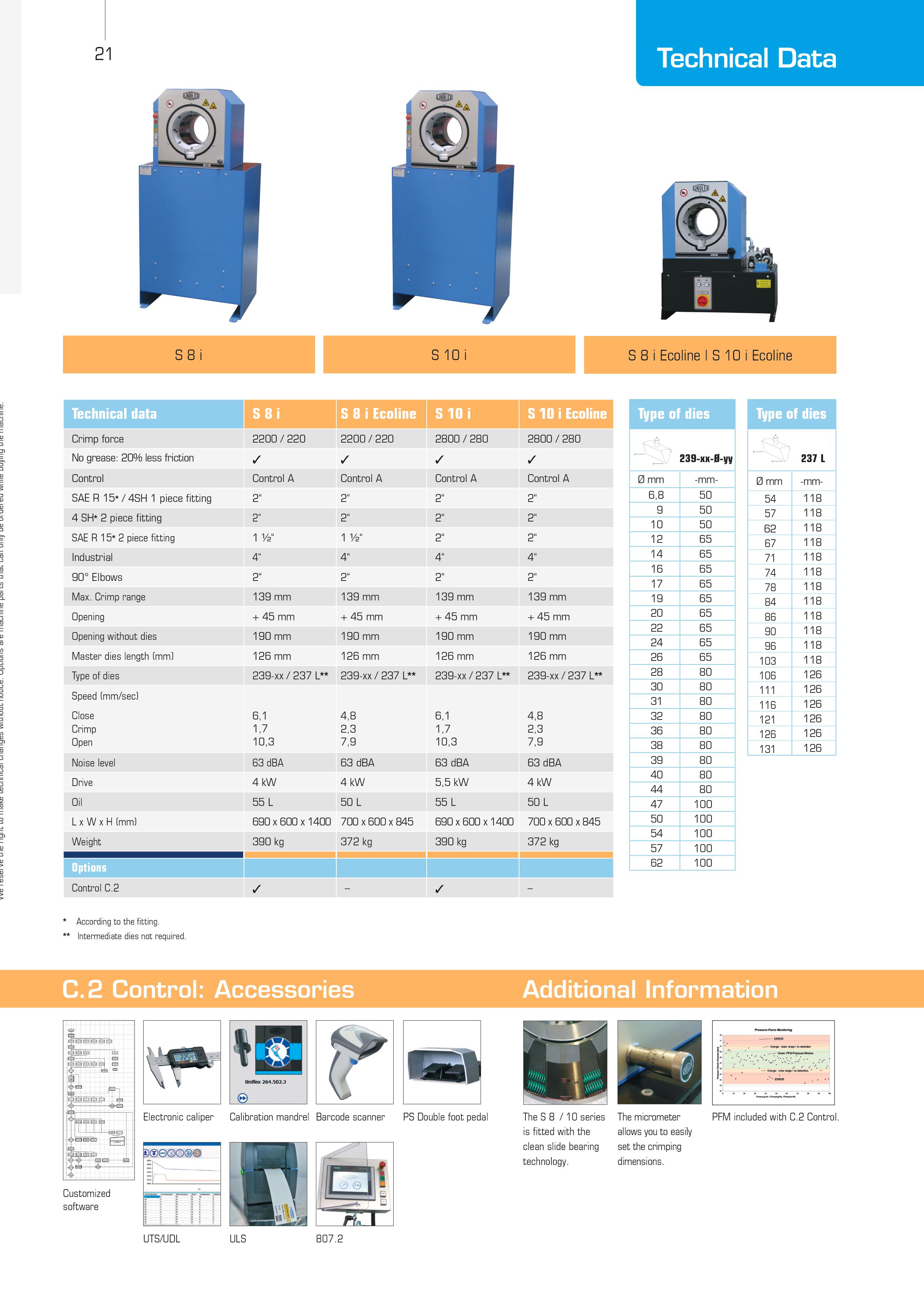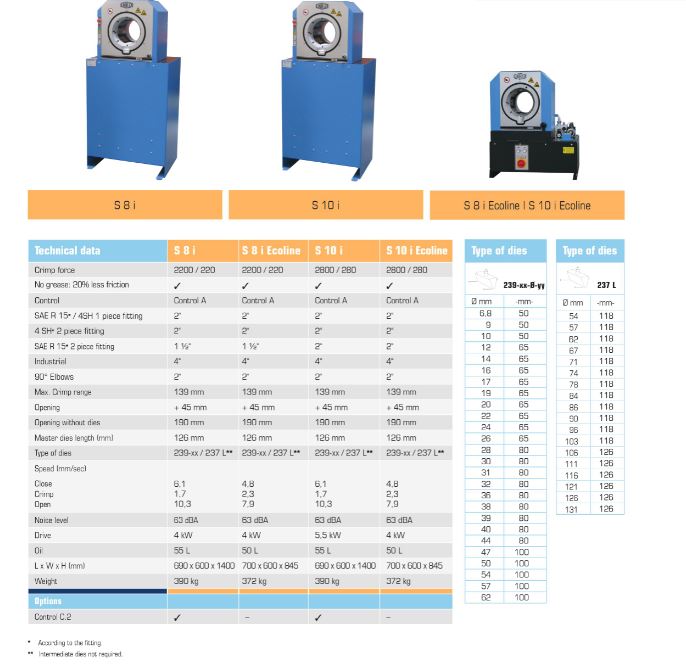 دستگاه پرس شیلنگ S۱۰i با توجه به طراحی باریک و خلاقانه ای که دارد طرفدار های زیادی به خود جذب کرده و طول عمر بالایی هم دارد . این دستگاه استاندارد های خوبی برای کیفیت و کاهش هزینه ها دارد. جهت استفاده در کارگاه هایی مناسب است که احتیاج به مونتاژ شیلنگ به منظور انجام تعمیرات و یا تولید (نه در سطح زیاد) دارند . هدف گذاری این دستگاه برای بازار شیلنگ های ۲ اینچ و یا کمتر است. همچنین فضای مناسبی را برای کار در اختیار شما قرار میدهد، هم برای اتصالات مستقیم و هم برای اتصالات زانویی.