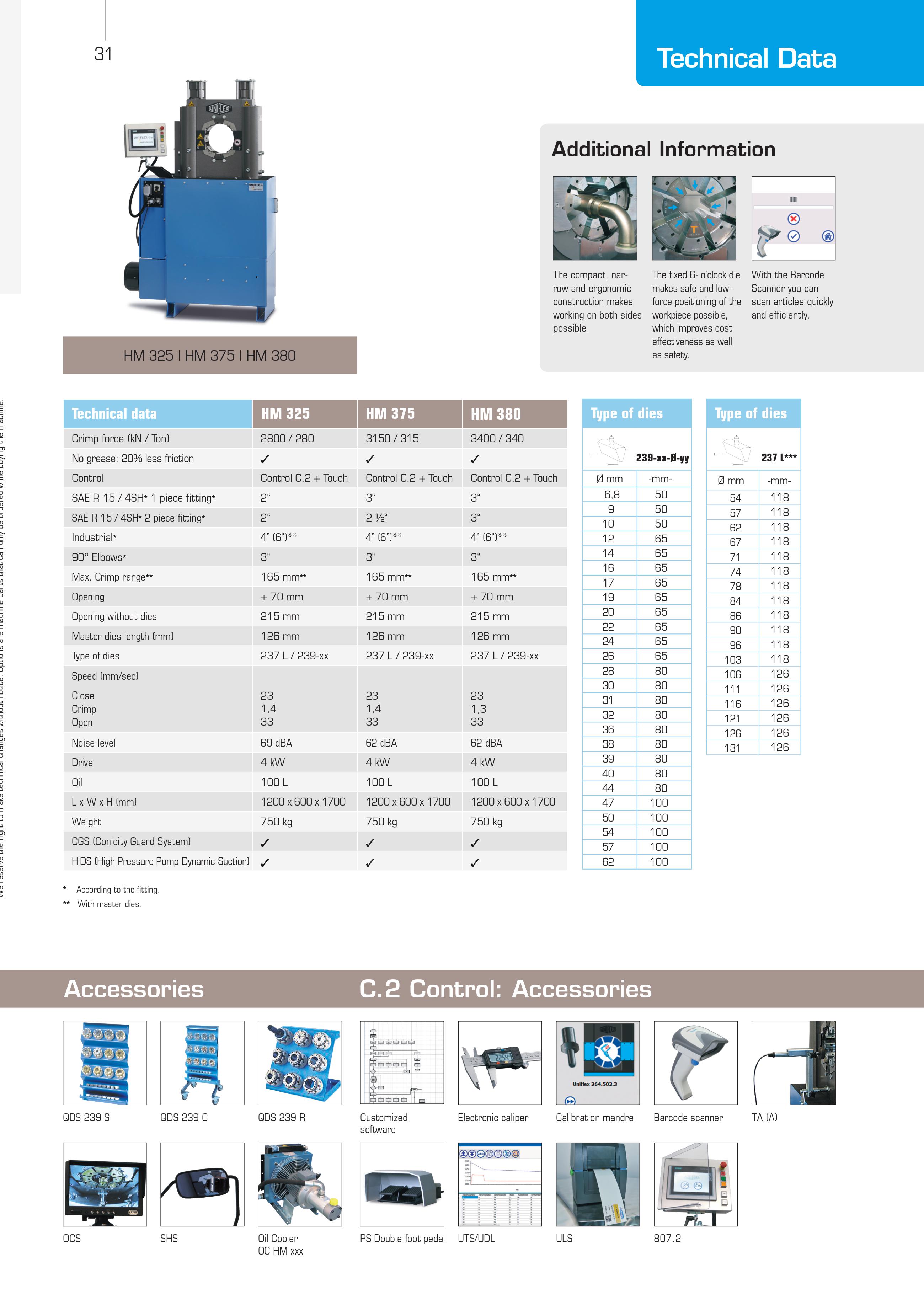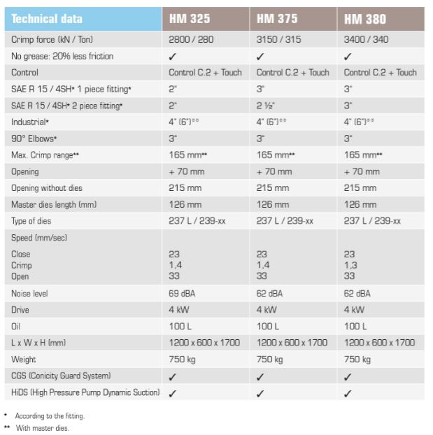 همان طور که بیان شد این دستگاه در سه نوع HM325 , HM375 , HM380 تولید میشود. نیروی اعمالی آنها به ترتیب برابر ۲۸۰ , ۳۱۵ , ۳۴۰ تن میباشد. این دستگاه ها نیز مانند دیگر دستگاه های تولیدی شرکت یونیفلکس آلمان احتیاج به روغن کاری ندارند که هزینه های نگهداری دستگاه را به شدت کاهش میدهد. حداکثر قطری که این دستگاه میتواند پرس کنند به ۱۶۵ میلیمتر میرسد.