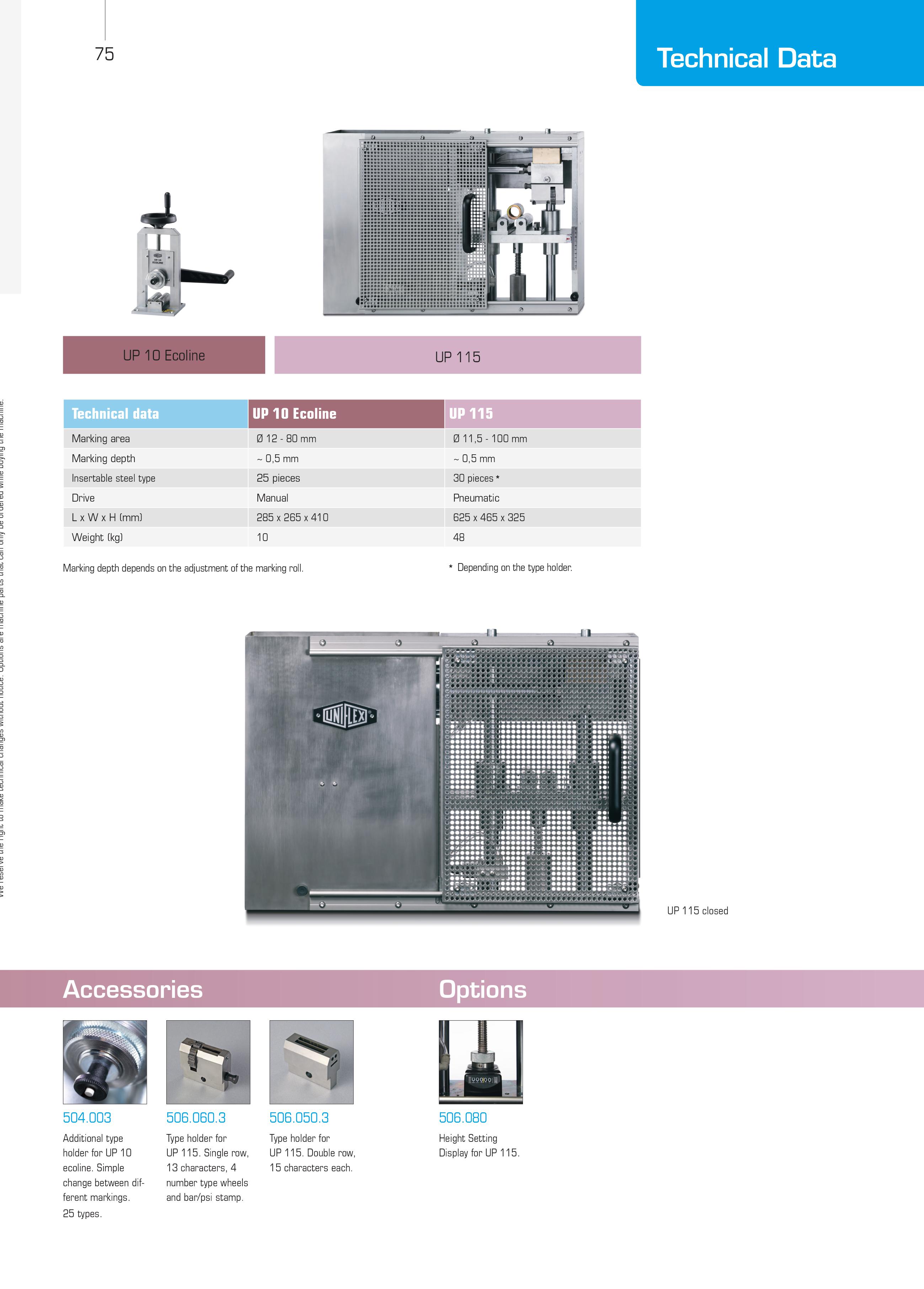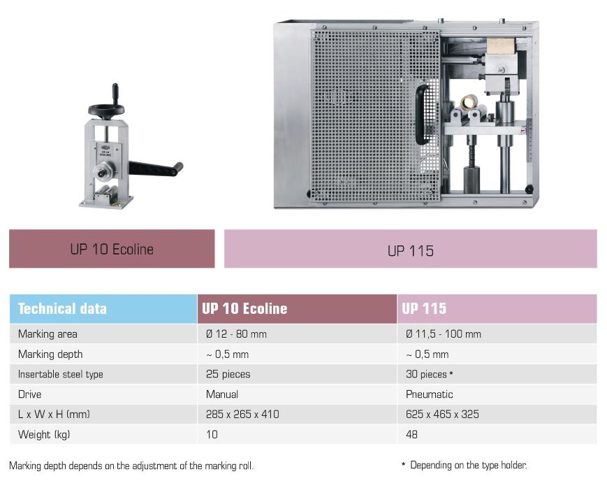 دستگاه علامت گذار UP 10 Ecolines قادر به حکاکی و علامتگذاری بر روی شیلنگ هایی به قطر حداکثر ۸۰ میلیمتر است. حکاکی ها تا عمق ۰.۵ میلیمتر نفوذ میکند. در این دستگاه از قطعات کوچک فلزی برای حکاکی استفاده میشود که هر کدام از آنها یک کاراکتر به حساب میآیند و حداکثر ظرفیت آن ۲۵ کاراکتر است. ابعاد این دستگاه ۲۸۵×۲۶۵×۴۱۰ میلیمتر بوده و کاملا مناسب برای حمل و نقل ، وزن آن نیز ۱۰ کیلوگرم است.
