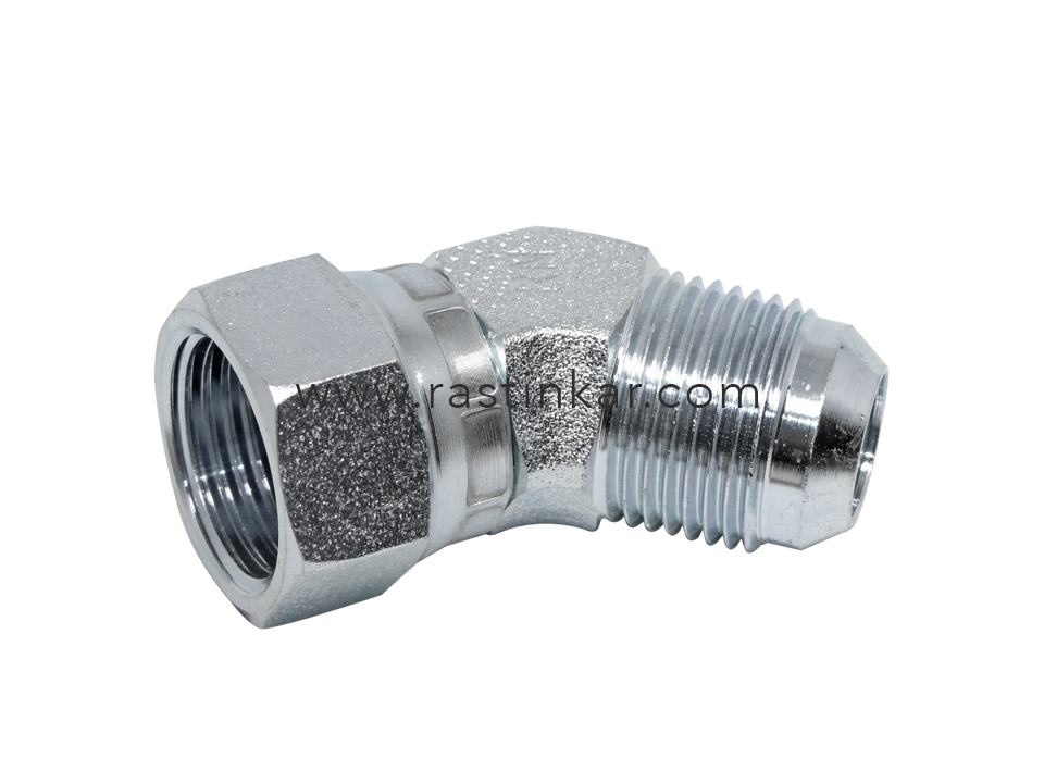 نیم خم پرچی گردان ( ۴۵° Swivel Connector m JIC X f JIC) یک واسط پرچی ( JIC ) میباشد که با زاویه ۴۵ درجه طراحی شده و قابلیت چرخیدن دارد و به همین دلیل به آن گردان میگویند. به این مغزی ها محل بند نیز میگویند.
