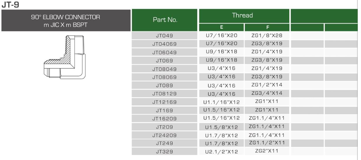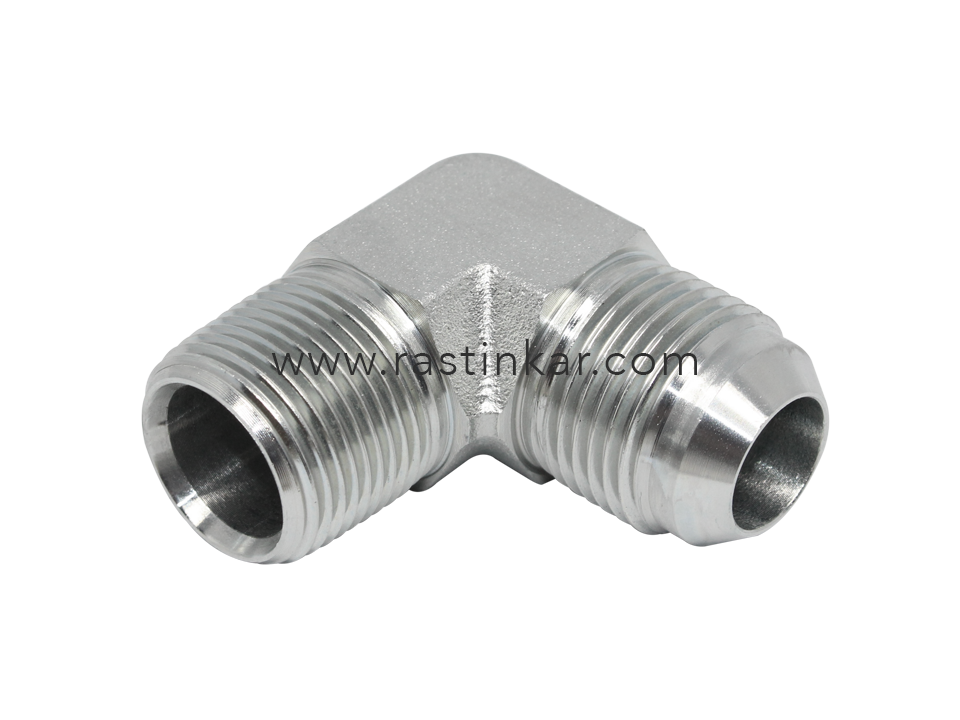 زانویی نری JIC به BSPT (۹۰° Elbow m JIC X m BSPT) یک تبدیل سری پرچی (JIC) به سری انگلیسی (BSPT) میباشد که به صورت زانویی با زاویه ۹۰ درجه طراحی شده. هر دو سری این آداپتور یا تبدیل به صورت نری میباشد. بدین معنا که به شکل رودنده طراحی شده و داخل یک اتصال ماده پیچ میشود. در ادامه توضیح مختصری درباره اتصالات JIC و BSPT آورده شده است.