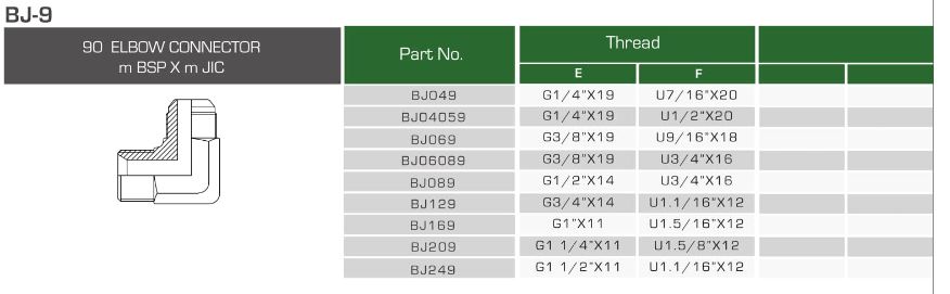 زانویی نری BSP به JIC ( ۹۰° Elbow Connector m BSP X m JIC) یک تبدیل سری انگلیسی (BSP) به سری پرچی (JIC) میباشد که به صورت زانویی زانویی با زاویه ۹۰ درجه طراحی شده. هر دو سری این آداپتور یا تبدیل به صورت نری میباشد، بدین معنا که به شکل رودنده طراحی شده و داخل یک اتصال ماده پیچ میشود. در ادامه توضیح مختصری درباره اتصالات BSP و JIC آورده شده است.