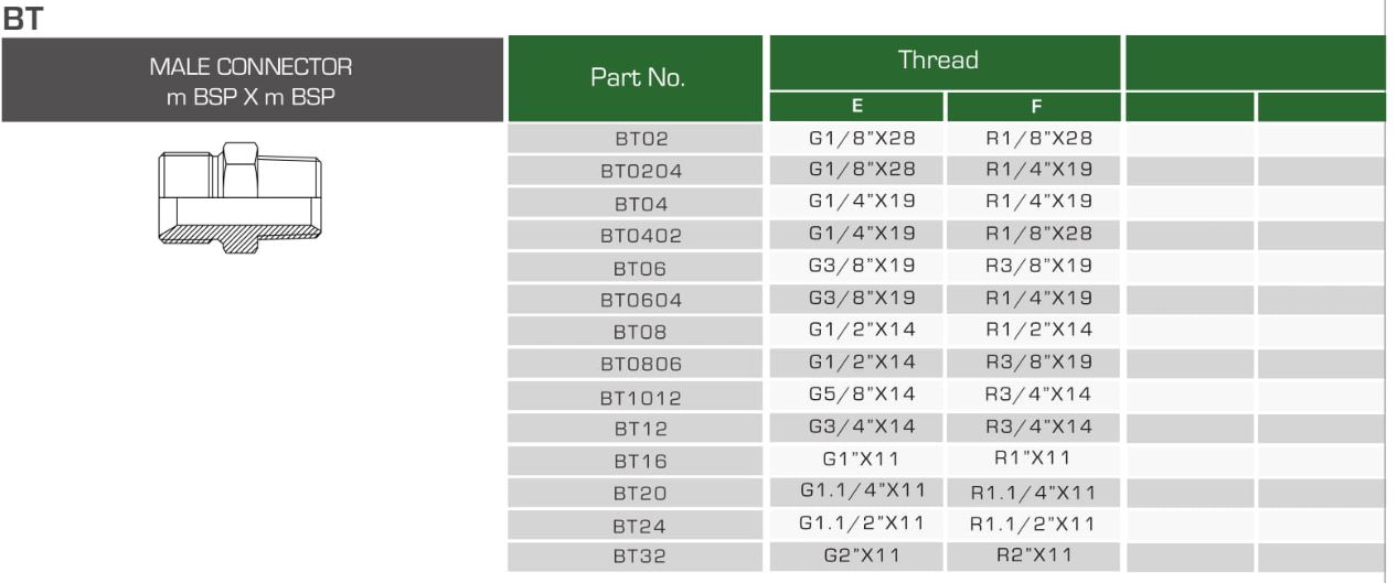 واسطه نری BSP به BSPT ( Male Connector m BSP X m BSPT) یک تبدیل سری انگلیسی BSP به BSPT میباشد که هر دو سری این آداپتور یا تبدیل به صورت نری میباشد. بدین معنا که به شکل رودنده طراحی شده و داخل یک اتصال ماده پیچ میشود. در ادامه توضیح مختصری درباره اتصالات BSP و BSPT آورده شده است.