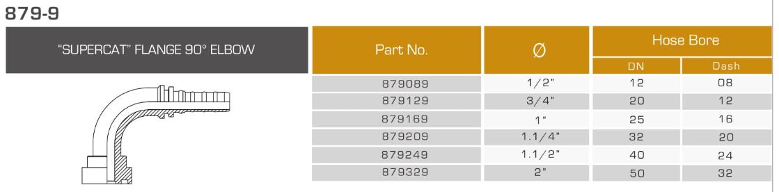 سرشيلنگی فلنج خم ( ۹۰° “Supercat” Flange ) یک نوع سرشیلنگی هیدرولیک ثابت فلنج است و دنباله این قطعه که باریک و دندانه دار است داخل شیلنگ مورد نظر فرو میرود و به واسطه آن دندانه ها در جای خود محکم میشود. طراحی این سرشیلنگی به شکل خم با زاویه ۹۰ درجه میباشد. این سرشیلنگی ها با توجه با اندازه خود فشار کاری تعریف شده ۱۸۵ تا ۳۵۰ بار دارند. سرشیلنگی خم فلنج ۱۴ در ابتدایی ترین حالت خود برای افزایش قدرت و استحکام یک ساختاری از اتصالات و همچنین اضافه کردن یک قسمت مکانیکی و متحرک به آن استفاده میشود.