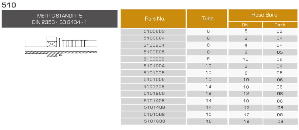 مهره دنباله میلی مترمیل ( Metric Standpipe) یک نوع سرشیلنگی آلمانی کونیک ۲۴ است. این نوع سرشینگی به شکل صاف طراحی شده و کونیک آن ۲۴ درجه است. دنباله این قطعه که باریک و دندانه دار است داخل شیلنگ مورد نظر فرو میرود و به واسطه آن دندانه ها در جای خود محکم میشود. سر دیگر آن نیز از طریق مهره ای که دارد داخل اتصالات محکم میشود به شکلی که اتصال ثانوی داخل این مهره پیچ میشود.
