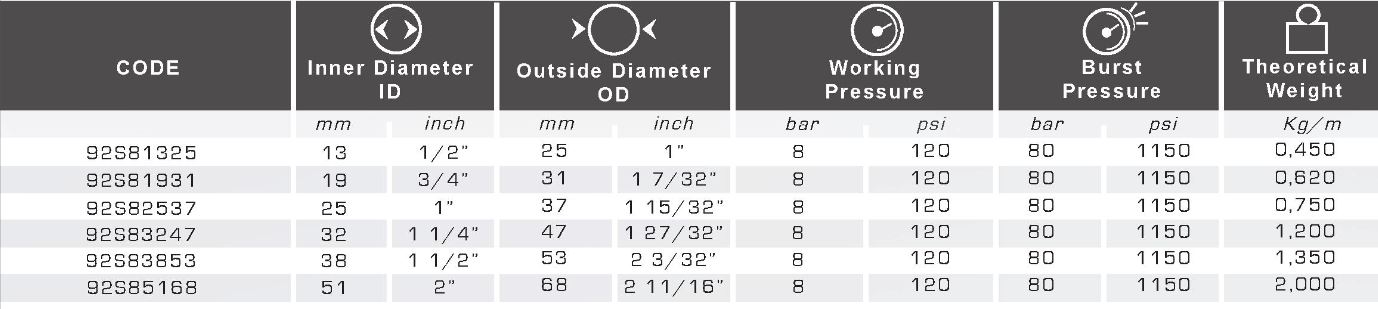این شیلنگ ها در قطرهایی بین ۱/۲ – ۲ اینچ تولید می شوند و فشار کاری آنها برابر با ۸ بار می باشد. محدوده دمایی استاندارد این محصول بین منفی ۴۰ تا مثبت ۱۷۰ درجه سانتی گراد می باشد .