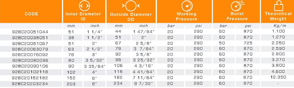 | (inch) قطر داخلی شیلنگ | 1 1/4" – 8" |