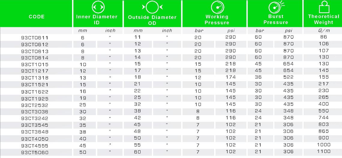 این شینگ در سایز های بین ۱۲ تا ۶۰ میلیمتر تولید میشود. فشار کاری آن بسته به قطر آن بین ۷ تا ۲۰ باراست. و توانایی کار در دماهای بین منفی ۱۵ تا مثبت ۶۰ درجه سلسیوس را دارد .