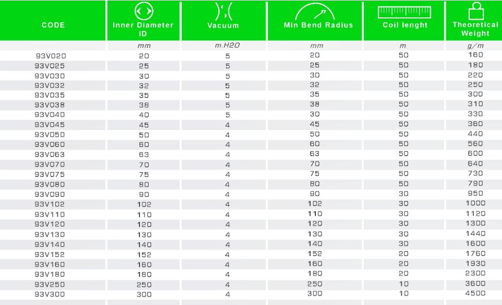 شلنگ تهویه مناسب استخراج هوا ، گاز ، گرد و خاک و بخار ، مکش خاک اره ، تکه های چوب است. انعطاف پذیری بالای آن باعث شده تا برای واحدهای سیار بسیار مناسب باشد. این شیلنگ در سایزهای بین ۲۰ تا ۳۰۰ میلیمتر تولید میشود و توانایی کار در دماهای بین منفی ۱۵ تا مثبت ۶۵ درجه سلسیوس را دارد. انعطاف پذیر، مقاوم در برابر شوک و پوشش پی وی سی سخت از دیگر ویژگی های آن است. این شیلنگ از جنس PVC ساخته شده است،