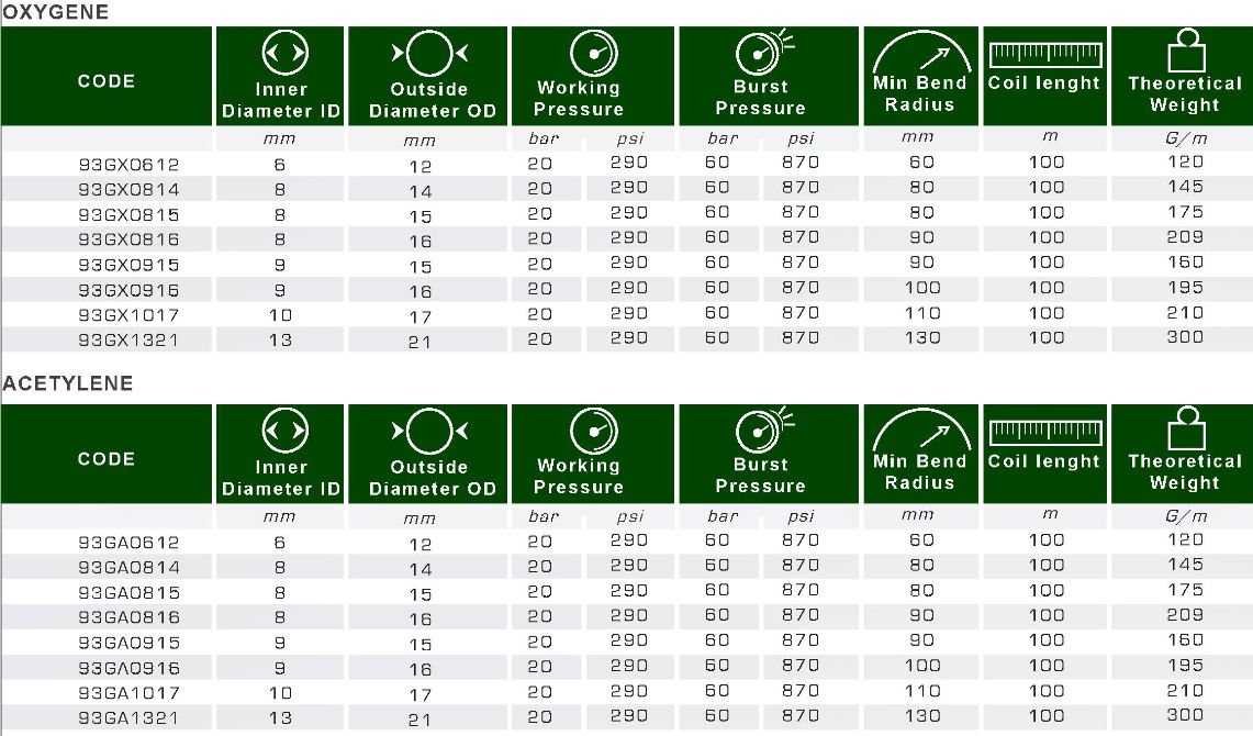 به طور کلی دارای دو مدل یکی مخصوص اکسیژن (آبی رنگ) و یکی مخصوص استیلن (قرمز رنگ) است. و هرکدام دارای یک مدل با قطر داخلی ۶ میلیمتر ، سه مدل با قطر داخلی ۸ میلیمتر (ضخامت های متفاوت). و دو مدل با قطر داخلی ۹ میلیمتر (ضخامت متفاوت)، یک مدل قطر داخلی ۱۰ میلیمتر و در نهایت یک مدل با قطر داخلی ۱۳ میلیمتر است. قطر خارجی آنها به ترتیب به صورت زیر است: