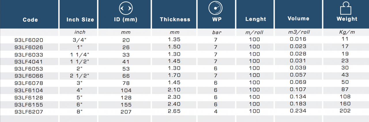 محدوده دمایی آن از منفی ۵ تا مثبت ۶۵ درجه است. در ساخت شیلنگ تخت کتابی برای مواد اولیه از PVC با کیفیت استفاده شده است که غیر سمی بوده و بدون بو است. همچنین در استفاده های کشاورزی و باغبانی به گیاهان آسیب نمیرساند. طول عمر این شیلنگ ها بالاست و معمولا بین ۴ تا ۶ سال میتوان از آنها استفاده کرد. مقام به سرما بوده و در هوای سرد سفت نشده و به صورت نرمال کار خود را انجام میدهد. بنابراین در هر چهار فصل میتوان از آن استفاده کرد. این شیلنگ در سایز های ۳/۴″ تا ۸″ موجود است که دارای مقاومت های ۷ و ۶ بار هستند . میزان مقاومت هر کدام را به تفکیک میتوانید در جدول مشاهده کنید.